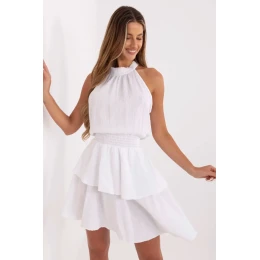 Lehké a vzdušné šaty ideální na letní dny. Vyrobené z prodyšné, příjemné na dotek bavlněné mušelínové látky, která zajišťuje pohodlí i v největším horku. Střih s rozkročeným střihem, s délkou před kolena, krásně zdůrazňuje ženskou siluetu. Smýčky v pasu s vloženou gumou jemně modelují pas, a dolní část s volánky dodává lehkost a jemný půvab. Šaty mají kulatý výstřih a jsou bez rukávů, takže se ideálně hodí na každodenní letní aktivity. Vzadu elegantní šněrování na výšku krku zdůrazňuje jemnost zad a dodává celku romantický charakter. Univerzální, hladký vzor z nich činí skvělou základnu pro každodenní styling, stačí přidat žabky, slaměný klobouk a jste připraveni na procházku po pláži nebo oběd s kamarádkou.