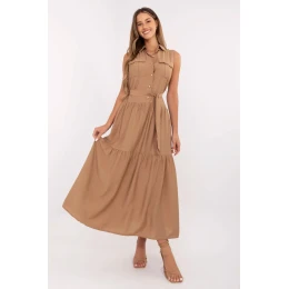 Elegantní a pohodlné šaty s rozkvetlým střihem, které spojují každodenní volnost s nádechem elegance. Vyrobena z průsvitné směsi viskózy a nylonu, skvěle se hodí jak do práce, tak do každodenních situací. Model maxi délky, bez rukávů, s klasickým límečkem a zapínáním na knoflíky až po pas. V pasu je pásek k zavázání, který jemně zdůrazňuje postavu a umožňuje přizpůsobit šaty figurce. K šatům přidávají další šarm kapsy s klopami v oblasti prsou, které vnáší jemný akcent stylu utility, a široká volán na spodku, který dodává lehkost a ženský charakter. Díky hladkému vzoru jsou šaty univerzálním základem pro mnoho stylizací, skvěle vypadají jak s sandály, tak s klasickými balerínami nebo espadrilkami.