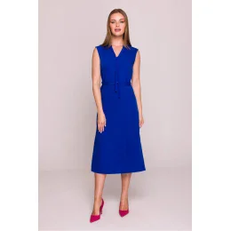 Objevte eleganci a pohodlí v jednom díle díky této jedinečné midi šaty. Navržená a ušita v Polsku, kombinuje klasický styl s moderními detaily, skvěle splňuje potřeby moderní ženy. Šaty jsou vyrobeny z hladké, lehce elastické látky s saténovým zpracováním, která se krásně přizpůsobuje postavě, zajistí pohodlí při nošení. Její jednoduchý střih s lehce zdůrazněnou pasem a lehkým trapezovým tvarem zaručuje elegantní vzhled a volnost pohybu. Délka midi sahající za koleno jí dodává univerzální charakter. Výstřih ve tvaru písmene V s vázáním dole přidává šatům jemnou smyslnost a umožňuje individuální přizpůsobení. Bez rukávů je to ideální volba na teplejší dny. Praktické rozparky na bocích nejen usnadňují pohyb, ale také přidávají kreaci špetku pikantnosti. V pasu je látkový pás s elegantní sponou, který dokonale zdůrazní pas. Šaty se zapínají pomocí skrytého zipu na boku, což zajišťuje snadné oblékání a nevidit