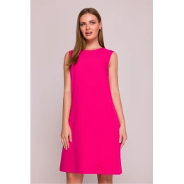 Elegantné šaty z hladkej, mierne elastickej tkaniny s lesklou saténovou úpravou, ktorá sa jemne leskne a dodáva celku jedinečný charakter. Model s okrúhlym výstrihom pod krkom zdobí kovový detail, ktorý dodáva jemnú eleganciu. Šaty bez rukávov so skrytým zapínaním na zips na chrbte, ktoré zabezpečuje pohodlné nosenie a minimalistický vzhľad. Strih je jednoduchý, lichobežníkový, voľný a neobopínajúci postavu, ideálny na každý deň a do kancelárie. Šaty majú podšívku, ktorá zvyšuje pohodlie a odolnosť oblečenia. Dĺžka pred kolená zdôrazňuje ženskú siluetu a zároveň zabezpečuje voľnosť pohybu. Navrhnuté a vyrobené v Poľsku.