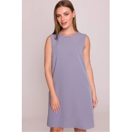 Elegantné šaty z hladkej, mierne elastickej tkaniny so saténovou úpravou, ktorá sa jemne leskne a dodáva celku výnimočný charakter. Model s okrúhlym výstrihom pod krkom zdobený kovovým prvkom, ktorý dodáva jemnú eleganciu. Šaty bez rukávov, zapínané na skrytý zips na chrbte, ktorý zaručuje pohodlie pri nosení a minimalistický vzhľad. Strih jednoduchý, lichobežníkový, voľný a nesediaci na postave, ideálny na každý deň a do kancelárie. Šaty majú podšívku, ktorá zvyšuje pohodlie a odolnosť oblečenia. Dĺžka pred kolená zdôrazňuje ženskú siluetu a zároveň poskytuje voľnosť pohybu. Navrhnuté a ušité v Poľsku.