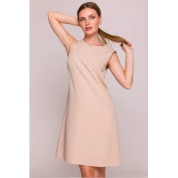 Elegantné šaty z hladkej, mierne elastickej tkaniny so saténovou úpravou, ktorá sa jemne leskne a dodáva celku výnimočný charakter. Model s okrúhlym výstrihom zdobí kovový prvok, ktorý dodáva jemnú eleganciu. Šaty bez rukávov so skrytým zapínaním na zips na chrbte, ktoré zaručuje pohodlie pri nosení a minimalistický vzhľad. Strih je jednoduchý, lichobežníkový, voľný a nesedí na postave, ideálny na každý deň a do kancelárie. Šaty majú podšívku, ktorá zvyšuje pohodlie a odolnosť oblečenia. Dĺžka pred kolená zdôrazňuje ženskú siluetu a zároveň zaručuje voľnosť pohybu. Navrhnuté a ušité v Poľsku.