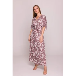 Tieto ľahké, vzdušné šaty sú vyrobené z ľahkej, priedušnej viskózy zdobenej jemným kvetinovým vzorom, ktorý im dodáva romantický charakter. Voľný strih s rozšírenou spodnou časťou a šnurovaním v páse umožňuje pohodlné nosenie a zvýrazňuje siluetu. Výstrih do V jemne zvýrazňuje krk a voľné rukávy siahajúce po lakeť zabezpečujú pohodlie a voľnosť pohybu. Šaty nemajú podšívku ani vrecká, čo zdôrazňuje ich ľahkosť a prirodzený štýl. Vpredu je efektný rozparok, ktorý celku dodáva eleganciu a ľahkosť. Navrhnuté a ušité v Poľsku, ideálne na teplé dni, na bežné nosenie aj na výnimočné príležitosti.