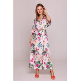 Tieto ľahké šaty sú vyrobené z ľahkej, priedušnej viskózy zdobenej jemným kvetinovým vzorom, ktorý im dodáva romantický nádych. Voľný strih s rozšírenou spodnou časťou a zaväzovaním v páse umožňuje pohodlné nosenie a zvýrazňuje postavu. Výstrih do V jemne zvýrazňuje krk a voľné rukávy siahajúce po lakeť zabezpečujú pohodlie a voľnosť pohybu. Šaty nemajú podšívku ani vrecká, čo zdôrazňuje ich ľahkosť a prirodzený štýl. Vpredu je efektný rozparok, ktorý celku dodáva eleganciu a ľahkosť. Navrhnuté a ušité v Poľsku, ideálne na teplé dni, na všedné dni aj na špeciálne príležitosti.