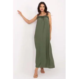 Tieto letné maxi šaty bez ramienok vyrobené z ľahkej, priedušnej viskózy sú ideálnou voľbou na každodennú štylizáciu počas teplých dní. Mierne rozšírený strih zvýrazňuje ženskú siluetu a zaručuje voľnosť pohybu. Šaty majú obdĺžnikový výstrih zdobený jemným volánom, ktorý celému outfitu dodáva romantický nádych. Hoci prevláda hladká látka, na ramienkach sa objavuje módny akcent v podobe leopardieho vzoru, ktorý outfitu dodáva trochu dravosti. Model nemá zapínanie a nosí sa cez hlavu, čo zvyšuje pohodlie pri nosení. Ideálne na prechádzky, nákupy alebo letné stretnutia s priateľmi.