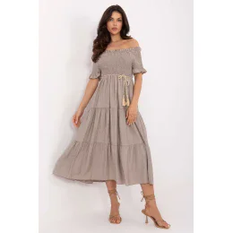 Tieto letné midi šaty s rozšíreným strihom sú skvelou voľbou na každodenné nosenie, ako aj na významné príležitosti. Sú vyrobené z ľahkej a priedušnej zmesi viskózy a nylonu a poskytujú pohodlie pri nosení počas teplých dní. Hladká tkanina zdôrazňuje elegantný a zároveň nenápadný charakter šiat. Vrchná časť s hispánskym výstrihom s riasením a elastickými pásmi krásne zvýrazňuje ramená a dodáva stylingu ženskosť. Krátke rukávy zakončené volánmi dodávajú ľahkosť a romantický pôvab. Model nemá zapínanie, nosí sa cez hlavu. V páse je opasok na zaväzovanie, ktorý umožňuje zvýrazniť postavu a prispôsobiť šaty vašej postave. Ideálne na prechádzky, letné večierky alebo stretnutia s blízkymi.