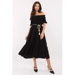 Tieto letné midi šaty s rozšíreným strihom sú skvelou voľbou na každodenné nosenie aj slávnostné príležitosti. Sú vyrobené z ľahkej a priedušnej zmesi viskózy a nylonu a poskytujú pohodlie počas teplých dní. Hladká tkanina podčiarkuje elegantný a zároveň nenápadný charakter šiat. Vrchná časť s hispánskym výstrihom, vráskami a elastickými pásmi krásne zvýrazňuje ramená a dodáva stylingu ženský nádych. Krátke rukávy s volánmi dodávajú ľahkosť a romantický pôvab. Model nemá zapínanie, navlieka sa cez hlavu. V páse je opasok na zaviazanie, ktorý zvýrazní postavu a prispôsobí šaty postave. Ideálne na prechádzky, letné párty alebo stretnutia s blízkymi.