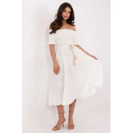 Tieto letné midi šaty s rozšíreným strihom sú skvelou voľbou na každodenné nosenie aj na výnimočné príležitosti. Sú vyrobené z ľahkej a priedušnej zmesi viskózy a nylonu a poskytujú pohodlie počas teplých dní. Hladká tkanina podčiarkuje elegantný a zároveň nenápadný charakter šiat. Vrchná časť je zakončená španielskym výstrihom s riasením a elastickými pásmi, ktoré krásne zvýrazňujú ramená a dodávajú oblečeniu ženskosť. Krátke rukávy s volánmi dodávajú ľahkosť a romantický pôvab. Model sa nezapína, nasadzuje sa cez hlavu. V páse je opasok na zaväzovanie, ktorý umožňuje zvýrazniť postavu a prispôsobiť šaty vašej postave. Ideálne na prechádzky, letné večierky alebo stretnutia s blízkymi.