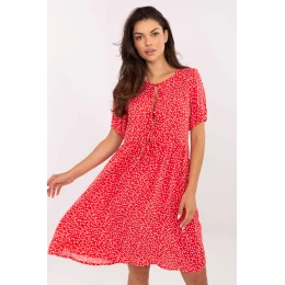 Ľahké a pohodlné šaty s rozšíreným strihom, ideálne na letné dni. Sú vyrobené z príjemnej viskózy, ktorá jemne obopína postavu a zabezpečuje priedušnosť. Potlač na materiáli oživuje styling a dodáva mu letný charakter. Šaty siahajú tesne nad kolená, majú krátke rukávy a klasický okrúhly výstrih. Namiesto tradičného zapínania majú vpredu až po pás originálne šnurovanie, ktoré im dodáva šarm. Rozšírený spodný okraj zabezpečuje voľnosť pohybu a ľahké nosenie. Skvelá voľba na každodenné prechádzky, nákupy alebo stretnutia s priateľmi. Štýlové, pohodlné a plné letného šarmu.