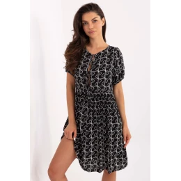 Ľahké a pohodlné šaty so stupňovitým strihom, ideálne na letné dni. Vyrobené z príjemnej viskózy, ktorá jemne obopína postavu a zabezpečuje priedušnosť. Potlač na materiáli oživí outfit a dodá mu letný charakter. Šaty siahajú pred kolená, majú krátke rukávy a klasický okrúhly výstrih. Namiesto tradičného zapínania majú vpredu až po pás originálne šnurovanie, ktoré im dodáva šarm. Stupňovitý strih zabezpečuje voľnosť pohybu a ľahké nosenie. Skvelá voľba na každodennú prechádzku, nákupy alebo stretnutie s priateľmi. Štýlové, pohodlné a plné letného šarmu.