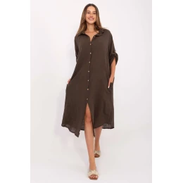 Tieto letné košeľové šaty nadmernej veľkosti sú ideálnou voľbou na každodenný outfit. Sú vyrobené z priedušnej prírodnej bavlny a poskytujú pohodlie aj počas teplejších dní. Model v midi dĺžke je doplnený klasickým golierom a zapínaním na gombíky po celej dĺžke. 3/4 rukávy s možnosťou zapínania na gombíky zvyšujú funkčnosť a umožňujú prispôsobiť šaty rôznym teplotám. Hladký materiál a voľný strih dodávajú šatám univerzálny charakter a vložené vrecká ukryté na bokoch sú praktickým prvkom, ktorý podčiarkuje každodenný, ležérny štýl týchto šiat.