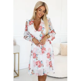 Tieto romantické kvetinové obálkové šaty sú ideálnou voľbou na jar, leto a výnimočné udalosti. Sú vyrobené z ľahkého, priedušného materiálu, krásne sa prispôsobia pohybu a poskytujú pohodlie počas celého dňa. Jemný kvetinový vzor v odtieňoch ružovej a modrej, hlboký výstrih do V a dlhé, priehľadné rukávy dodávajú celému kompletu ženský šarm. Šnurovačka v páse jemne zvýrazňuje postavu a rozšírený spodný lem vytvára efekt ľahkosti a voľnosti.