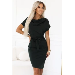 Tieto elegantné, na mieru šité šaty v modernom odtieni tmavej khaki nesmú chýbať v ženskom šatníku. Model má krátke rukávy, decentný výstrih typu voda a opasok uviazaný v páse, ktorý krásne zvýrazní postavu. Vyrobené sú z kvalitného elastického materiálu, ktorý zaručuje pohodlné nosenie a ideálne prispôsobenie sa postave. Šaty sú ideálne na každodenné nosenie, do práce, ako aj na stretnutia a elegantné udalosti. Stavte na eleganciu a pohodlie, vyberte si šaty od značky Numoco a cíťte sa výnimočne každý deň! Poľský výrobok značky Numoco.