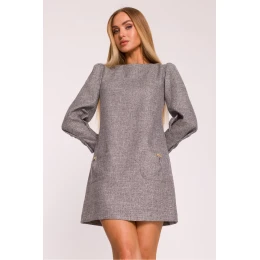 Elegantní šaty z tvidové látky v melírovém vzoru jsou návrhem spojujícím klasický šarm s dívčím půvabem. Strukturovaný materiál krásně padne na siluetu a jeho charakteristická faktura dodává celku výrazný styl. Model s výstřihem ve tvaru lodičky a dlouhými rukávy se skladkami na ramenou vypadá decentně a žensky. Límcové záhyby na spodních koncích rukávů jim přidávají elegantní tvar a skrytý zip na zádech zajišťuje pohodlí a estetické provedení. Na přední straně jsou umístěny nášivky ozdobené bižuterními mašlemi, které prolamují klasickou linii střihu a přinášejí efektní, dekorativní akcent. Trapézový střih, jemně přizpůsobený v ramenou a volný v bocích, zaručuje pohodlí nošení a krásnou, harmonickou siluetu. Mini délka dodává šatům lehkost a moderní charakter. Navrženo a ušito v Polsku, ideální pro ženy, které oceňují eleganci s nádechem originálních detailů.