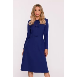 Šaty v tvare lichobežníka vyrobené z hladkej tkaniny s jemnou melírovanou štruktúrou. Polopriehľadný výstrih je doplnený jemným rozparkom pri krku, ktorý celku dodáva ľahkosť. Dlhé rukávy zdôrazňujú elegantný charakter modelu a praktické vrecká skryté na bokoch zvyšujú pohodlie pri nosení. Ozdobné mašle umiestnené v strede predného dielu dodávajú šatám dievčenský šarm a výnimočný dizajn. Voľnejší spodný diel v tvare písmena A na bokoch a dĺžka za kolená dodávajú strihu voľnosť aj štýl. Model bez podšívky, zapínaný vzadu na skrytý zips, je ideálny na každodenné aj slávnostné udalosti. Navrhnuté a ušité v Poľsku.