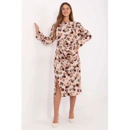 Tieto elegantné midi šaty s jednoduchým, klasickým strihom sú ideálnou voľbou na mnohé príležitosti, ako sú obchodné stretnutia, návštevy alebo každodenné vychádzky. Sú vyrobené z vysokokvalitnej zmesi viskózy a polyesteru a spájajú v sebe pohodlie s odolnosťou. Kvetinový vzor im dodáva romantický charakter a zabudované ramenné vypchávky jemne zvýrazňujú siluetu. Model s dlhými rukávmi a okrúhlym výstrihom pôsobí veľmi elegantne. Drapéria na pravej strane v páse a efektné záhyby krásne tvarujú postavu, dodávajú jej ľahkosť a ženský pôvab. Šaty nemajú zapínanie, čo umožňuje ich pohodlné nosenie.