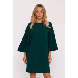 Elegantné šaty v tvare lichobežníka, ktoré sú vyrobené z hladkej, na dotyk príjemnej tkaniny. Model vyniká efektnými širokými netopierími rukávmi v 3/4 dĺžke, ktoré celku dodávajú ľahkosť a jemný charakter. Polokruhový výstrih decentným spôsobom zvýrazňuje ženskú siluetu a voľný pás zaručuje pohodlné nosenie a neodhaľuje postavu. Spodná časť šiat je rovná, čo v kombinácii s voľným vrchom vytvára harmonický, elegantný celok. Šaty sa vzadu zapínajú na skrytý zips, vďaka čomu pôsobia mimoriadne esteticky. Mini dĺžka nad kolená im dodáva moderný charakter, takže sú ideálnou voľbou na elegantné večierky, ako aj na menej formálne stretnutia. Navrhnuté a ušité v Poľsku s dôrazom na každý detail.