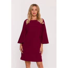 Elegantné šaty v tvare lichobežníka, ktoré sú vyrobené z hladkej, na dotyk príjemnej tkaniny. Model má efektné, široké, 3/4 dlhé netopierie rukávy, ktoré celku dodávajú ľahký a jemný charakter. Polkruhový výstrih jemným spôsobom zvýrazňuje ženskú siluetu a voľný pás zaručuje pohodlie pri nosení a neobmedzuje postavu. Spodná časť šiat je rovná, čo v kombinácii s voľným vrchným dielom vytvára harmonický, elegantný celok. Šaty sa zapínajú vzadu na skrytý zips, vďaka čomu pôsobia mimoriadne esteticky. Dĺžka mini pred kolená im dodáva moderný charakter, takže sú ideálnou voľbou na elegantné večierky, ako aj na menej formálne stretnutia. Navrhnuté a ušité v Poľsku s dôrazom na každý detail.