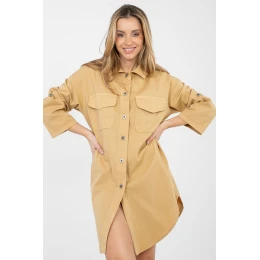 Pohodlné košeľové šaty s voľným strihom, ideálne na každodenné štýlové obliekanie. Model so zapínaním na gombíky a klasickým golierom, ktorý celku dodáva nadčasový charakter. Vďaka hladkému vzoru sú šaty neuveriteľne univerzálne a ľahko sa štylizujú. Sú vyrobené z bavlny jemnej na dotyk s prídavkom elastanu, čo zaručuje pohodlné nosenie a voľnosť pohybu. Dlhé rukávy s možnosťou ohrnutia umožňujú prispôsobiť šaty ročnému obdobiu a individuálnym preferenciám. Dĺžka pod kolená a spodný okraj jemne zaoblený zvýrazňuje postavu a dodáva ľahkosť. Na prednej strane sú praktické vrecká s panelmi, ktoré zvýrazňujú štýl šiat. Skvelá ponuka na každý deň do práce, na prechádzku alebo stretnutie v uvoľnenej atmosfére.