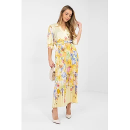 Letní maxi šaty s rozkročeným střihem jsou spojením lehkosti, elegance a ženského stylu. Model okouzluje květinovým vzorem, který stylizaci dodává svěžest a jemný půvab, ideálně zapadající do letního klimatu. Zavinový výstřih krásně zdůrazňuje linii krku a dekoltu, a 3/4 rukávy s volánem přidávají celkovému vzhledu romantický charakter. Od pasu dolů byly šaty vyrobeny z plisé materiálu, který efektně padá při pohybu a dodává siluetě lehkost. V pasu je zapínací pásek, umožňující zdůraznit ženské tvary a přizpůsobit model postavě. Šaty nemají žádné zapínání, což zajišťuje pohodlí při nošení. Vyrobené z kombinace polyesteru a viskózy, jsou prodyšné, lehké a pohodlné. Skvěle se hodí jak do každodenních stylizací, do práce, tak i na slavnostní příležitosti, stačí si vybrat vhodné doplňky, abyste vytvořili elegantní letní vzhled.