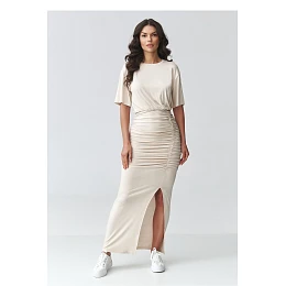 Mimořádně ženské maxi šaty se záhybem jsou nabídkou pro ženy, které oceňují styl spojený s pohodlím. Střih šatů krásně zdůrazňuje postavu a pružný materiál zajišťuje pohodlné nošení po celý den. Model má krátký rukáv a klasický, zakrytý výstřih, co mu dodává univerzální charakter. Efektní záhyb v pasu a na bocích opticky modeluje postavu a zdůrazňuje její výhody. Dalším prvkem je decentní rozpark na noze, který stylizaci dodává lehkost a smyslné zakončení. Jsou to ideální přizpůsobené šaty na každý den i na večírek, hodí se jak do neformálních stylizací s teniskami, tak do elegantnějšího provedení s podpatky. Skvělá volba na schůzky, večeře, oslavu nebo speciální příležitosti. Pokud hledáte model, který spojuje trendy střih s ženskou formou, tyto maxi šaty s rozparkem budou skvělým doplňkem vašeho šatníku.
