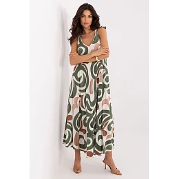 Šaty s rozšíreným strihom sú ľahkým a nápadným dizajnom ideálnym na každodennú štylizáciu. Ich voľný strih sa krásne prispôsobí postave a poskytuje pohodlie a priedušnosť aj počas teplejších dní. Model v maxi dĺžke upúta pozornosť modernou potlačou, ktorá celku dodáva výrazný a štýlový charakter. Výstrih v tvare srdca jemne zvýrazňuje dekolt a dodáva šatám ženskú ľahkosť. Šaty sú vyrobené z príjemnej viskózy, sú priedušné, mäkké a pohodlné na nosenie. Model je bez rukávov a bez zapínania, je pohodlný a praktický na každodenné nosenie. Je skvelou voľbou na letné dni, spája voľnosť, pohodlie a moderný, výrazný štýl.