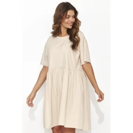 Ležérne mini šaty s jedinečným šarmom, ktoré majú na prednej strane našitú elegantnú zlatú platničku. Kreácia s krátkymi rukávmi a ležérnym strihom vyžaruje dievčenský šarm. Okrúhly výstrih dokonale podčiarkuje bezstarostný vzhľad a dodáva ľahkosť a voľnosť. Tieto šaty, ktoré sú k dispozícii v moka, svetlo béžovej, krémovej, čokoládovej a čiernej farbe, sú dokonalou voľbou na každodenné nosenie a dodajú štýl každodenným aktivitám. Skvele sa hodia do práce, ale aj na stretnutia s priateľmi. Všetko je len otázkou doplnkov. Je to kombinácia pohodlia, elegancie a dievčenskej jemnosti a veľmi pohodlný každodenný štýl.
