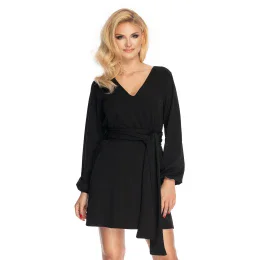 Mini šaty so špicatým výstrihom a dlhými rukávmi. Široký opasok v páse.