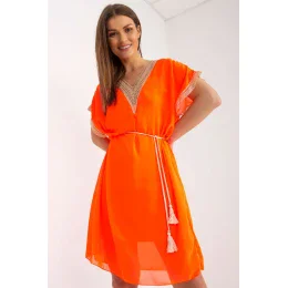 Voľne padnúce šaty s krátkymi rukávmi a srdiečkovým výstrihom. Šaty sú podšité a zaväzujú sa v páse.