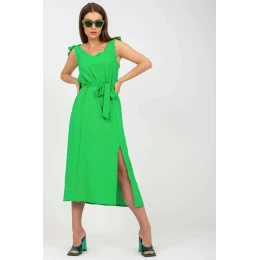Letné šaty s viazanými ramienkami, zaväzovanie v páse. Výrazný rozparok vpredu. Návrh pre mnoho príležitostí.