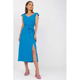 Letné šaty s viazanými ramienkami, zaväzovanie v páse. Výrazný rozparok vpredu. Návrh pre mnoho príležitostí.