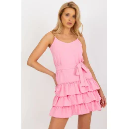 Mini šaty s retiazkovými ramienkami, srdiečkovým výstrihom a zaväzovaním v páse. Spodná časť šiat s tromi volánikmi.