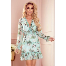Šifónové šaty s elastickým pásom a volánmi. Jemné volány po celom obvode šiat dodávajú šarm. Kvetinový vzor na zelenom podklade. Vyrobené zo šifónu s podšívkou (95 % polyester, 5 % elastan). Značka numoco. Vyrobené v Poľsku. LIMITOVANÁ EDÍCIA