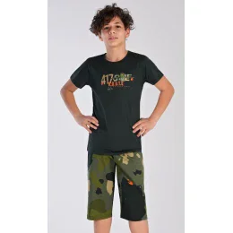 Detské bavlnené capri pyžamo Erik. Detské pyžamo pozostáva z trička s krátkym rukávom a trojštvrťových nohavíc. Jednofarebné tričko s okrúhlym výstrihom má nápis "417 one route". Maskáčové capri nohavice majú elastický pás a šnúrku na stiahnutie, ale nemajú vrecká. Použitý bavlnený materiál je príjemný a pružný na dotyk a pyžamo je vhodné na každodenné nosenie.