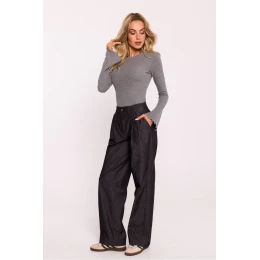 Štýlové dámske nohavice vyrobené z kvalitnej bavlnenej tkaniny. Majú široké nohavice, ktoré zabezpečujú pohodlie a elegantný vzhľad, a záložky v páse, ktoré jemne zvýrazňujú postavu. V páse je elastická guma, ktorá zabezpečuje pohodlie a ideálne prispôsobenie. Nohavice sa zapínajú na gombík a zips, čo im dodáva praktickosť. Vrecká na šnúrke ponúkajú ďalšiu funkčnosť. Navrhnuté a vyrobené v Poľsku spájajú moderný dizajn s vynikajúcim remeselným spracovaním.