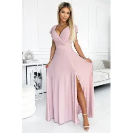 Dlhé trblietavé maxi šaty s obálkovým výstrihom a rázporkom na nohách. Šaty v špinavo ružovej farbe s trblietkami. Šaty krásne odhaľujú výstrih a perfektne sa hodia k tancu. Zapínajú sa na chrbte na krytý zips. Poľský výrobok. Značka Numoco.