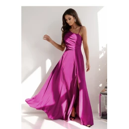 Dlhé rovné šaty s asymetrickými ramienkami, jedným tenkým, druhým hrubším. Šaty sú v páse prestrihnuté, spodná časť je rozšírená. Šaty sa zapínajú na skrytý zips na boku. Ozdobný rozparok na chrbte s pleteným šnurovaním.