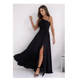 Dlhé rovné šaty s asymetrickými ramienkami, jedno tenké, druhé hrubšie. Šaty sú v páse prestrihnuté, spodná časť je rozrezaná. Šaty sa zapínajú na skrytý zips na boku. Ozdobný rozparok na chrbte s pletenými viazankami.