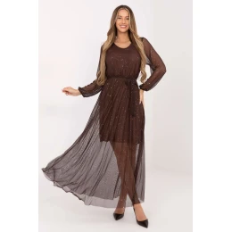 Tieto elegantné sieťované maxi šaty sú jedinečnou ponukou na spoločenské udalosti, ideálnou pre ženy, ktoré oceňujú nenápadný lesk a ľahkosť. Sú vyrobené z kombinácie polyesteru a viskózy, vyzerajú veľkolepo a zároveň poskytujú pohodlie vďaka mäkkej podšívke. Rozšírený strih modelu sa pri pohybe krásne tvaruje a vytvára ženskú a ľahkú siluetu. V páse je všitá guma a šnúrka na stiahnutie, aby ste si mohli prispôsobiť veľkosť podľa vlastných preferencií. Dlhé rukávy z jemnej sieťoviny, okrúhly výstrih a lesklé prvky na materiáli dodávajú šatám elegantný, večerný charakter. Maxi dĺžka ešte viac zdôrazňuje ich elegantný štýl. Štýlové, ženské a mimoriadne efektné, ideálne na večierky, slávnostné príležitosti a špeciálne udalosti.