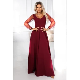 Tento jedinečný bordový maxi šaty značky Numoco spojuje klasickou eleganci s moderním provedením, které přitahuje pozornost hned na první pohled. Hladký, dokonale padnoucí vrchní díl krásně zdůrazňuje pas, zatímco rozkročený spodek zajistí lehkost a volnost pohybu. Průhledné tylové rukávy dodávají outfitu jemnou smyslnost, zachovávajíce zároveň jeho nadčasový charakter. Jedná se o ideální volbu na svatbu, ples, plesový večer, galavečer, Silvestra nebo večerní recepci. Šaty vypadají velmi efektně jak při pohybu, tak i na fotografiích, díky čemuž vytvářejí stylizaci, která zůstane dlouho v paměti. Pokud hledáte šaty, ve kterých se budete cítit elegantně, sebevědomě a opravdu výjimečně, tento model bude skvělou volbou. Vyrobeno v Polsku.