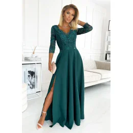 Elegantné dlhé čipkované šaty so srdiečkovým výstrihom. Nádherne tvarovaný dekolt a rozparek na sukni vytvárajú nevšednú kreáciu vo fľaškovo zelenej farbe. Poľská výroba. Značka Numoco.