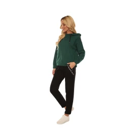 Dámsky teplákový úbor z bavlny, blúzka s dlhým rukávom, kapri a dlhé nohavice s vreckami, rukávy a vrecká ukončené lamelami s nápisom.