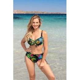 Tieto plavky sú kombináciou elegancie, pohodlia a funkčnosti a sú ideálne pre ženy, ktoré ocenia pohodlie a štýl na pláži alebo pri bazéne. Vystužená podprsenka so zapínaním na chrbte, s bočnými a spodnými výstužami, zaručuje vynikajúcu oporu a stabilitu pre plnšie poprsie. Hlboké, pohodlné košíčky dokonale priliehajú k poprsiu a zaisťujú pohodlie a estetický vzhľad. Plavky sa skladajú z dvoch častí, čo umožňuje voľnosť pohybu a prispôsobenie strihu. Pohodlný strih, podšité nohavičky zaručujú pocit bezpečia a pohodlia pri nosení. Ich vzorovaný dizajn a prídavné remienky im dodávajú jedinečný nádych. Je tiež vynikajúcou voľbou pre ženy s väčším poprsím, pretože poskytuje stabilitu a podporu potrebnú pri plážových aktivitách. Ramenné popruhy sú neodnímateľné, ale nastaviteľné, čo umožňuje individuálne preferencie a pohodlie pri nosení. Tieto plavky sú vyrobené z rýchloschnúceho materiálu, takže si môžete užívať plážovú zábavu bez obáv z dlhého schnutia. Poľský výrobok zabalený v elegantnej taške je zárukou kvalitného spracovania a spokojnosti s nákupom. Tieto plavky nielenže zvýrazňujú prirodzenú krásu, ale zároveň dodávajú každej žene pocit jedinečnosti a sebavedomia v každej situácii.