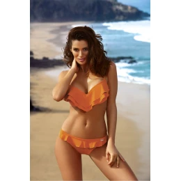 Jemné, veľmi ženské dvojdielne plavky s okúzľujúcimi volánikmi: Matylda M-469.Tieto plavky vám prepožičia výnimočný šarm (a navyše vám umožní zabudnúť na prípadné komplexy). Má skvelý strih. Bol vyrobený pre malé a stredné poprsie - dobre zbiera, tvaruje a dvíha prsia a výrazne ich zväčšuje. Výstrih získa pôvab, sex-appeal a vy maximálnu ženskosť. Jej tajomstvo? - sú košíčky vystužené jemnou penou, s kosticami a pomerne veľkou push-up výplňou, ktorá je tentoraz umiestnená trvalo vo vnútri podprsenky. Volániky vo výstrihu sú jedným z hlavných trendov leta. Ramienka sú nastaviteľné a obvod sa vzadu zaväzuje. Dopĺňajú ich koketné nohavičky, rovnako s volánikom. Plavky sú vyrobené z krásnej talianskej tkaniny Carvico a dodávajú sa v rade atraktívnych plážových farieb. Vyberte si ju vo svojom obľúbenom!