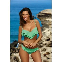 Jemné, veľmi ženské dvojdielne plavky s okúzľujúcimi volánikmi: Matylda M-469.Tieto plavky vám prepožičia výnimočný šarm (a navyše vám umožní zabudnúť na prípadné komplexy). Má skvelý strih. Bol vyrobený pre malé a stredné poprsie - dobre zbiera, tvaruje a dvíha prsia a výrazne ich zväčšuje. Výstrih získa pôvab, sex-appeal a vy maximálnu ženskosť. Jej tajomstvo? - sú košíčky vystužené jemnou penou, s kosticami a pomerne veľkou push-up výplňou, ktorá je tentoraz umiestnená trvalo vo vnútri podprsenky. Volániky vo výstrihu sú jedným z hlavných trendov leta. Ramienka sú nastaviteľné a obvod sa vzadu zaväzuje. Dopĺňajú ich koketné nohavičky, rovnako s volánikom. Plavky sú vyrobené z krásnej talianskej tkaniny Carvico a dodávajú sa v rade atraktívnych plážových farieb. Vyberte si ju vo svojom obľúbenom!
