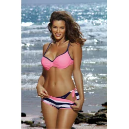 Trojdielne plavky v najkrajších letných farbách. Súčasťou sú sexy nohavičky a pohodlné šortky. Senzačná ponuka pre pláž. Ľahko športový štýl s veľkou dávkou ženského sex-appealu. Hladká horná časť, určená pre malé a stredné prsia. Strih dokonale zhromažďuje, pozdvihuje a opticky zväčšuje prsia, takže sú na slnkom prehriatej pláži krásnou ozdobou. Košíčky sú vystužené jemnou penou, majú kostice a zabudovanú push-up výplň. Bez ramienok, nastaviteľné ramienka, vzadu zaviazaný obvod. Sada obsahuje hladké nohavičky zvodne zaväzované na bokoch a šortky s peknými prúžkami. Môžete ich nosiť dohromady, jednu na druhej (ako vidíte na obrázku) alebo každú zvlášť. Vytvorte si z nich vlastné skvelé kompozície!