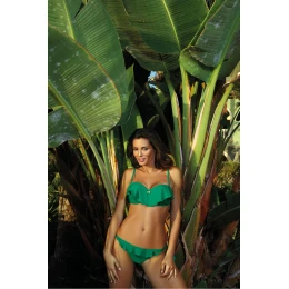 Krásne dvojdielne plavky zdobené módnymi, vzdušnými volánikmi tejto sezóny. So zlatou mašľou uprostred výstrihu. Brazílsky strih dna. Ak snívate o veľkých, pevných a sexy prsiach, krásne stiahnutých do výstrihu - tento návrh je presne pre vás. Plavky vyzerajú sladko a nevinne, sú k dostaniu v mnohých atraktívnych farbách a každé z nich je vyrobené zo skvelej, mäkkej a elastickej látky. Podprsenka sa vyznačuje skvelou konštrukciou určenou pre menšie a stredne veľké prsia - je vystužená a má pomerne veľkú push-up výplň, ktorá je v podprsenke trvalo umiestnená. Nastaviteľné, odnímateľné ramienka, ideálne na opaľovanie tela. Obvod sa zapína sponou. Nohavičky sú sexy, na bokoch zaviazané podprsenky s volánikom v hornej časti. Pre dokonalý efekt by mal byť spodný diel pritiahnutý k hornej časti bokov tak, aby jeho trojuholníkový tvar pekne zdobil spodný diel, ktorý čiastočne presahuje obrys spodného dielu.