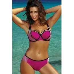 Štýlové dvojdielne plavky s módnymi ramienkami vo výstrihu a push-up efektom. Sexi a elegantné. Rozhodne jedny z najlepších plaviek sezóny. Plavky nádherne zdobia telo a vyzerajú obzvlášť zaujímavo a pútavo. Ramienka, "sieťované" boky, kontrastné lemovanie a krásne farby sú najväčšími prednosťami tohto modelu. Okrem toho má veľmi dobrý strih. Podprsenka s kosticou (spodná a bočná), založená na strihu bardotka, dokonale zhromažďuje, dvíha a tvaruje prsia a zároveň ich opticky zväčšuje. Obsahuje trvalú (z podprsenky neodnímateľnú) push-up výplň. Elastický obvod, zapínanie na pracku. Bez ramienok, nastaviteľná dĺžka. Nohavičky pôvabne zdobia boky, sú veľmi pohodlné a dokonale priliehajú k celku. Ažúrová výzdoba na bokoch. Plavky sú vyrobené z vysoko kvalitnej talianskej elastickej tkaniny. Najnovšia kolekcia na leto 2018.