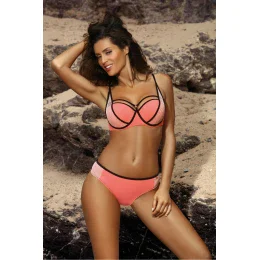 Štýlové dvojdielne plavky s módnymi ramienkami vo výstrihu a push-up efektom. Sexi a elegantné. Rozhodne jedny z najlepších plaviek sezóny. Plavky nádherne zdobia telo a vyzerajú obzvlášť zaujímavo a pútavo. Ramienka, "sieťované" boky, kontrastné lemovanie a krásne farby sú najväčšími prednosťami tohto modelu. Okrem toho má veľmi dobrý strih. Podprsenka s kosticou (spodná a bočná), založená na strihu bardotka, dokonale zhromažďuje, dvíha a tvaruje prsia a zároveň ich opticky zväčšuje. Obsahuje trvalú (z podprsenky neodnímateľnú) push-up výplň. Elastický obvod, zapínanie na pracku. Bez ramienok, nastaviteľná dĺžka. Nohavičky pôvabne zdobia boky, sú veľmi pohodlné a dokonale priliehajú k celku. Ažúrová výzdoba na bokoch. Plavky sú vyrobené z vysoko kvalitnej talianskej elastickej tkaniny. Najnovšia kolekcia na leto 2018.