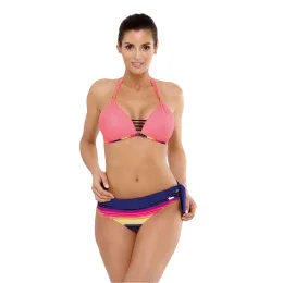 Štýlové plavky, v ktorých sa budete na pláži krásne vynímať. Podprsenka s trojuholníkovými košíčkami vystuženými špeciálnou penou, obohatená o push-up, vďaka ktorej sa prsia pozdvihnú a opticky zväčšia, čím vznikne zmyselný, hlboký dekolt. Push-up je trvalo umiestnený v plavkách a nie je z modelu vyberateľný, dodáva sa v každej veľkosti plaviek. Podprsenka upúta pozornosť aj módnym doplnkom v podobe "gumových pásikov" umiestnených vo výstrihu. Pekné ramienka uviazané pri krku, zdobené jemnou bižutérnou ozdobou (možno ju odňať), budú na slnku vyzerať atraktívne. Nohavičky majú dokonalý "midi" strih so stredovou výškou. Sú vzorované a ozdobne zaväzujú na boku (klasický, nazúvací strih).
